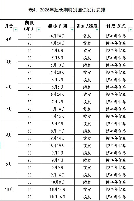 4月24日,2026年超长期特别国债(一期)、2026年超长期特别国债(二期)启动发行,分别为20年期固定利率附息债和30年期固定利率附息债。